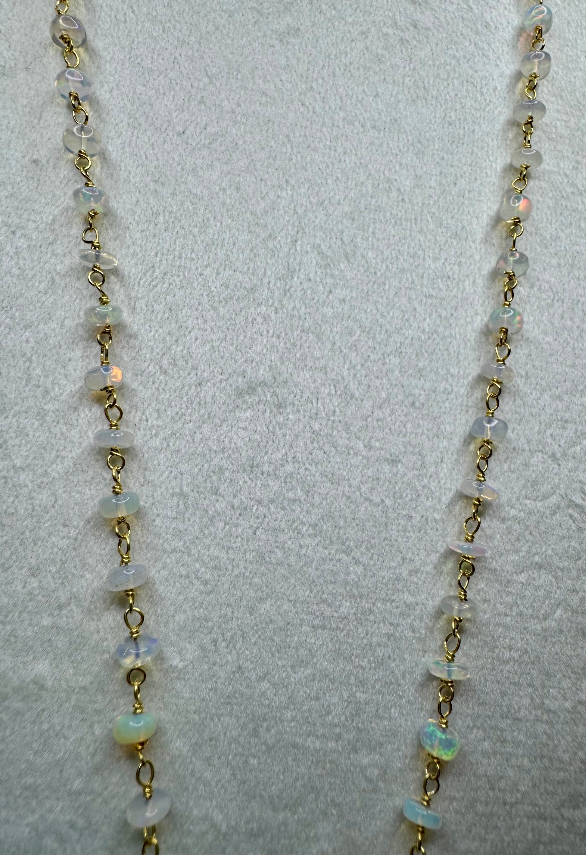 Blue-fire, half-moon moonstone focal set in a gold plated bezel paired with Ethiopian opal stone wire-wrapped chain. Beautiful and simple yet elegant.
