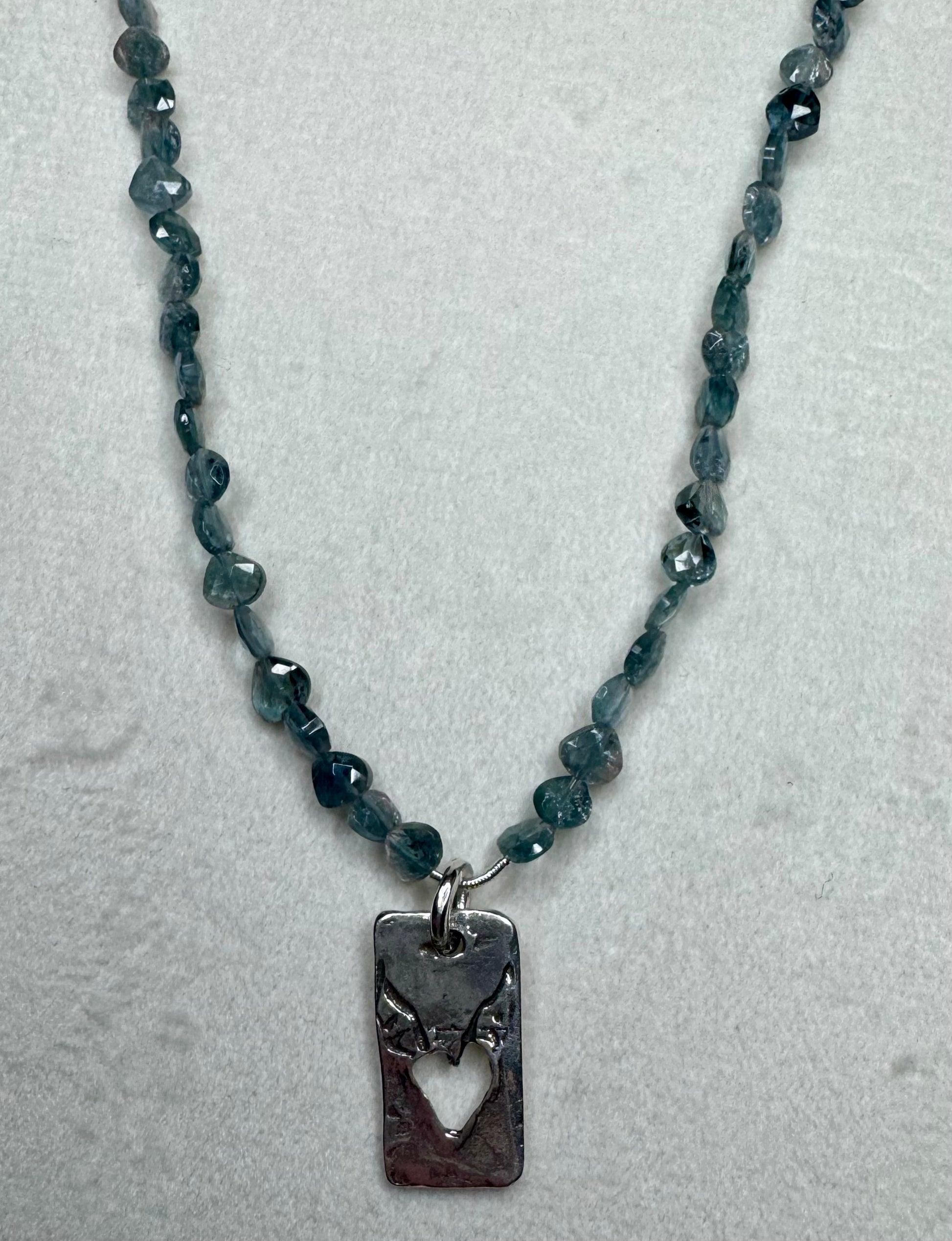 Indicolite tourmaline heart beads hold a delicate sterling heart with wings. Sterling silver chain and lobster clasp finish this delicate creature. She is sweet and dainty but says so much about you and your heart.