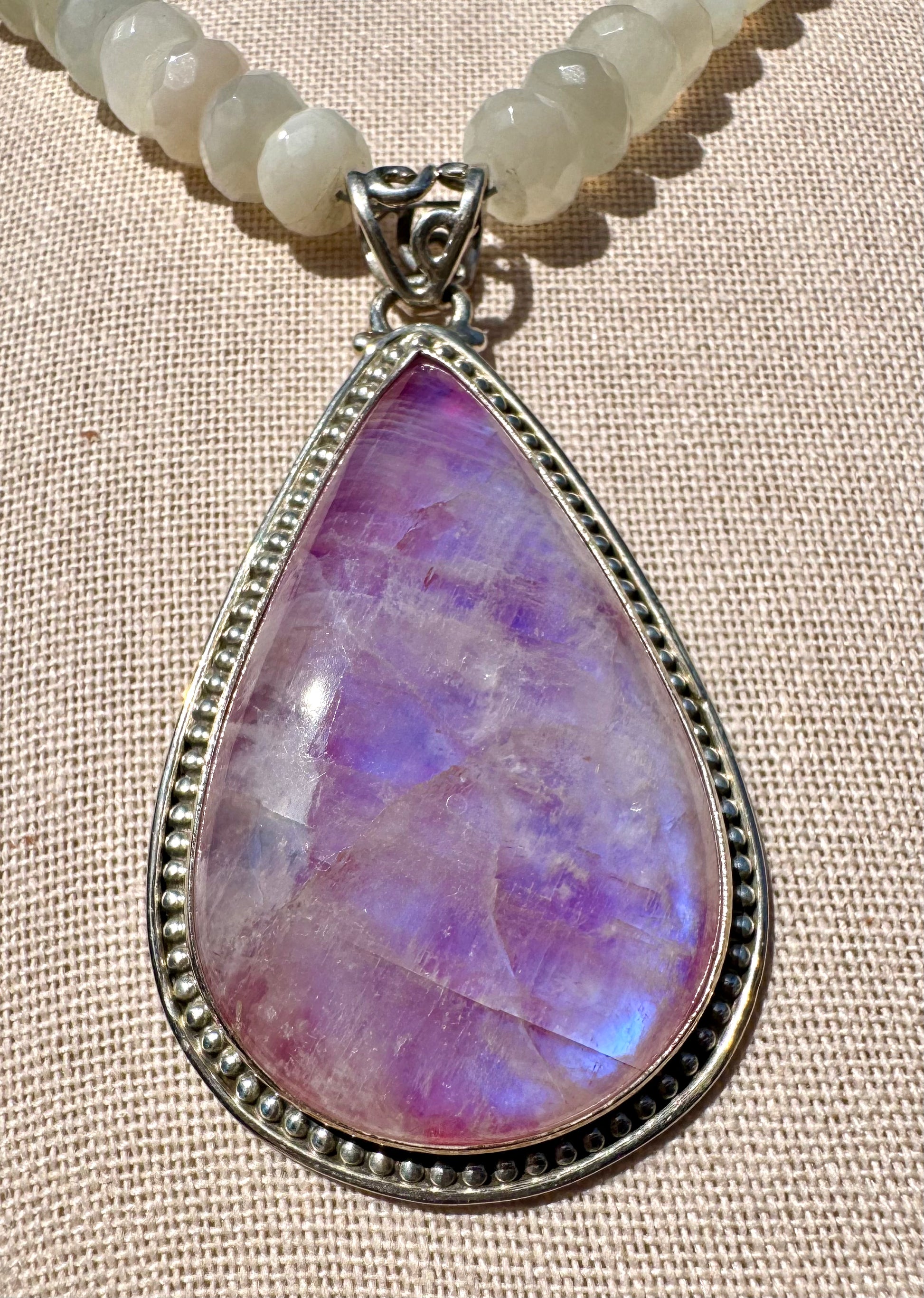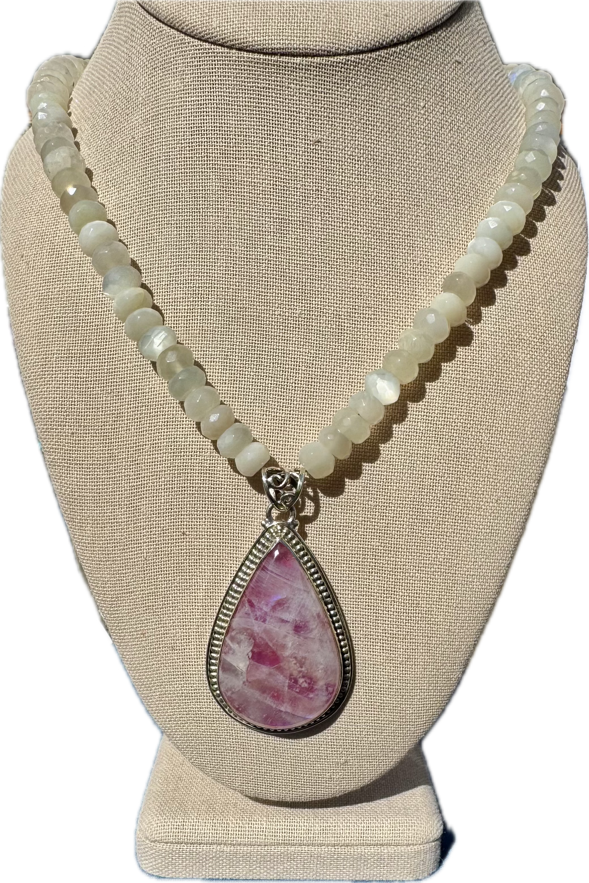 Blue-fire, pink moonstone lights up and glows. Paired with white moonstone and a sterling silver chain and clasp for adjustment. 22”L and chain extension
