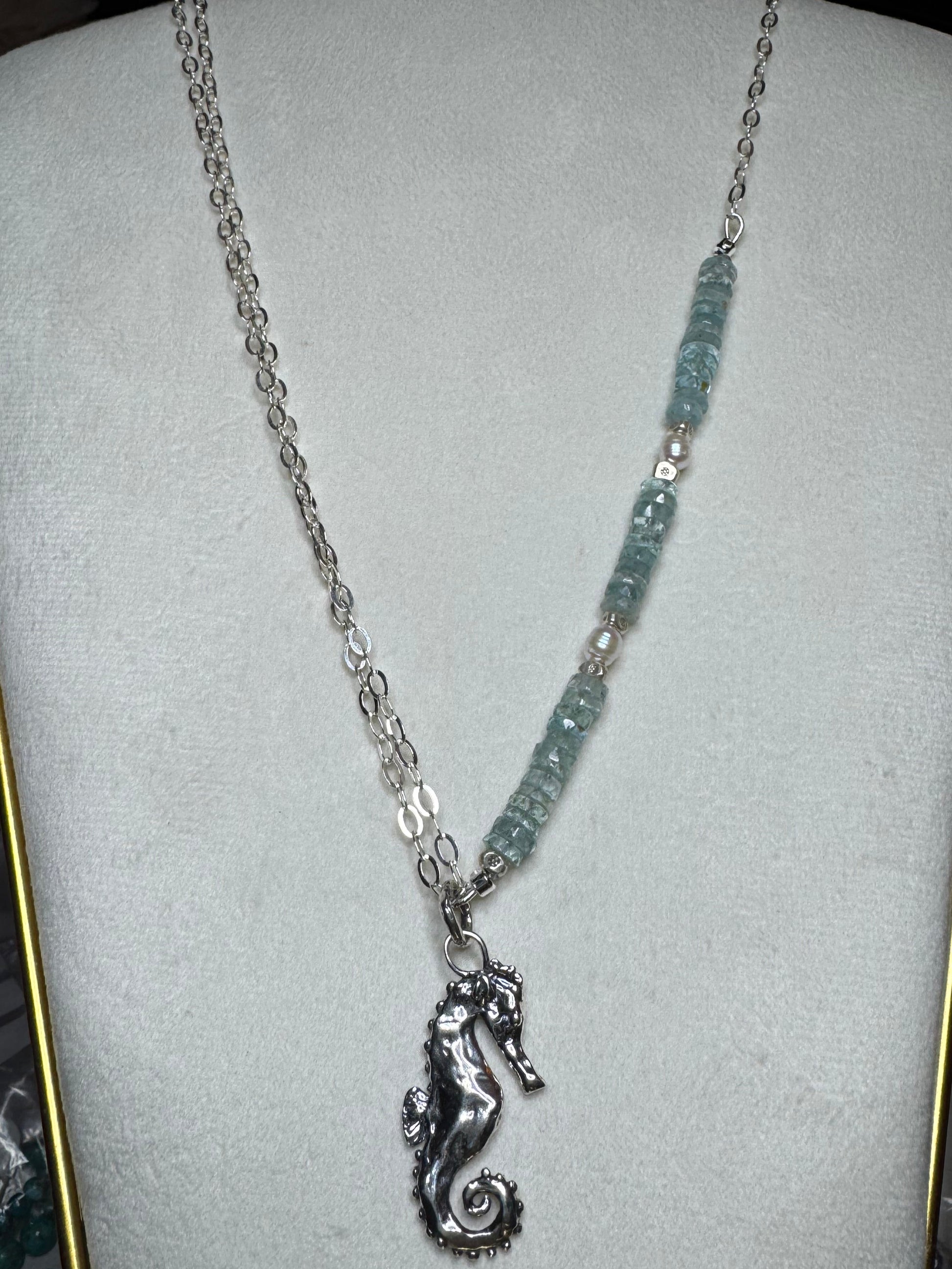 Pale heishi slices of aquamarine stones stack beautifully with tiny pearls and Karen Hill Tribe sterling silver beads to accent the sterling seahorse pendant and chain. 21”L not including pendant.
