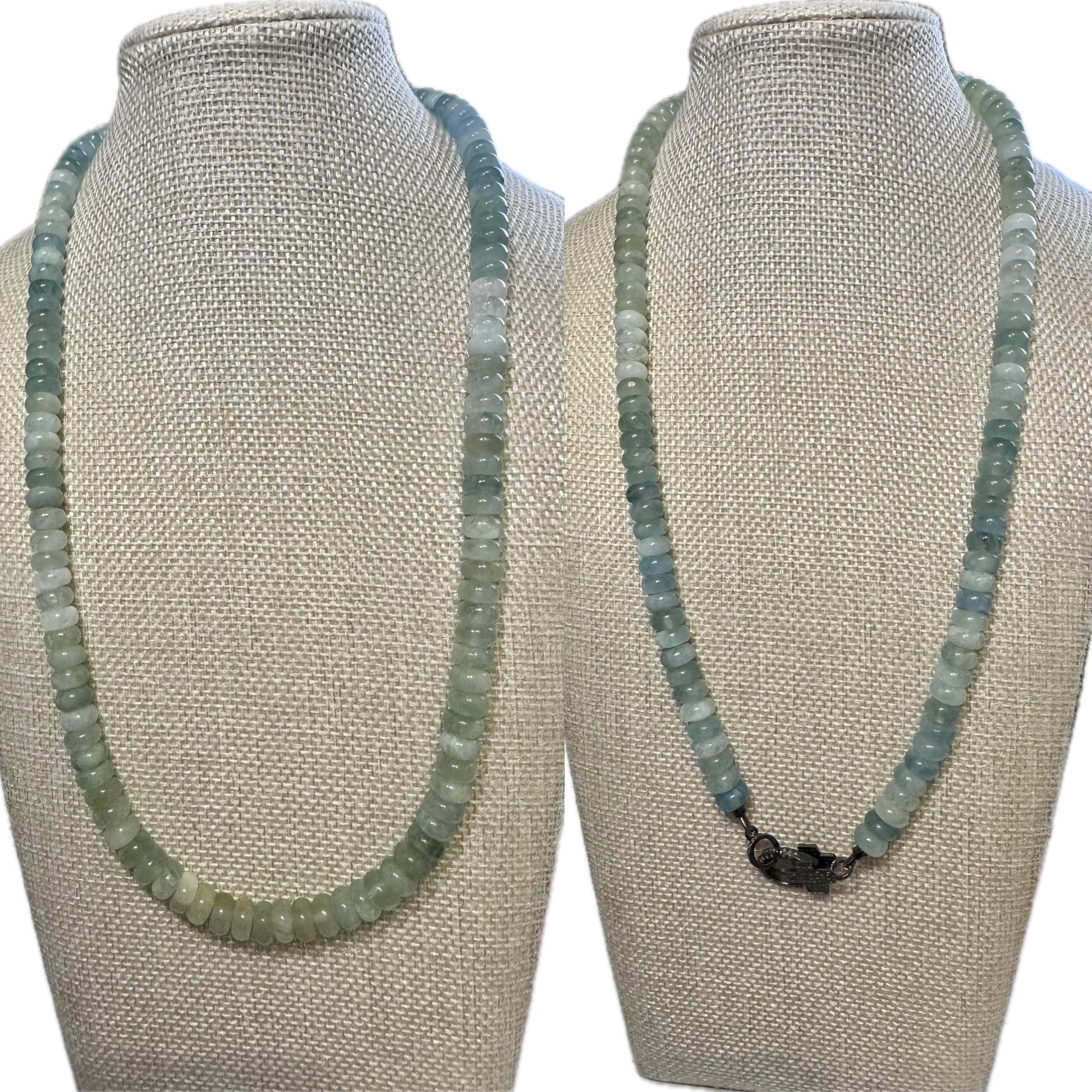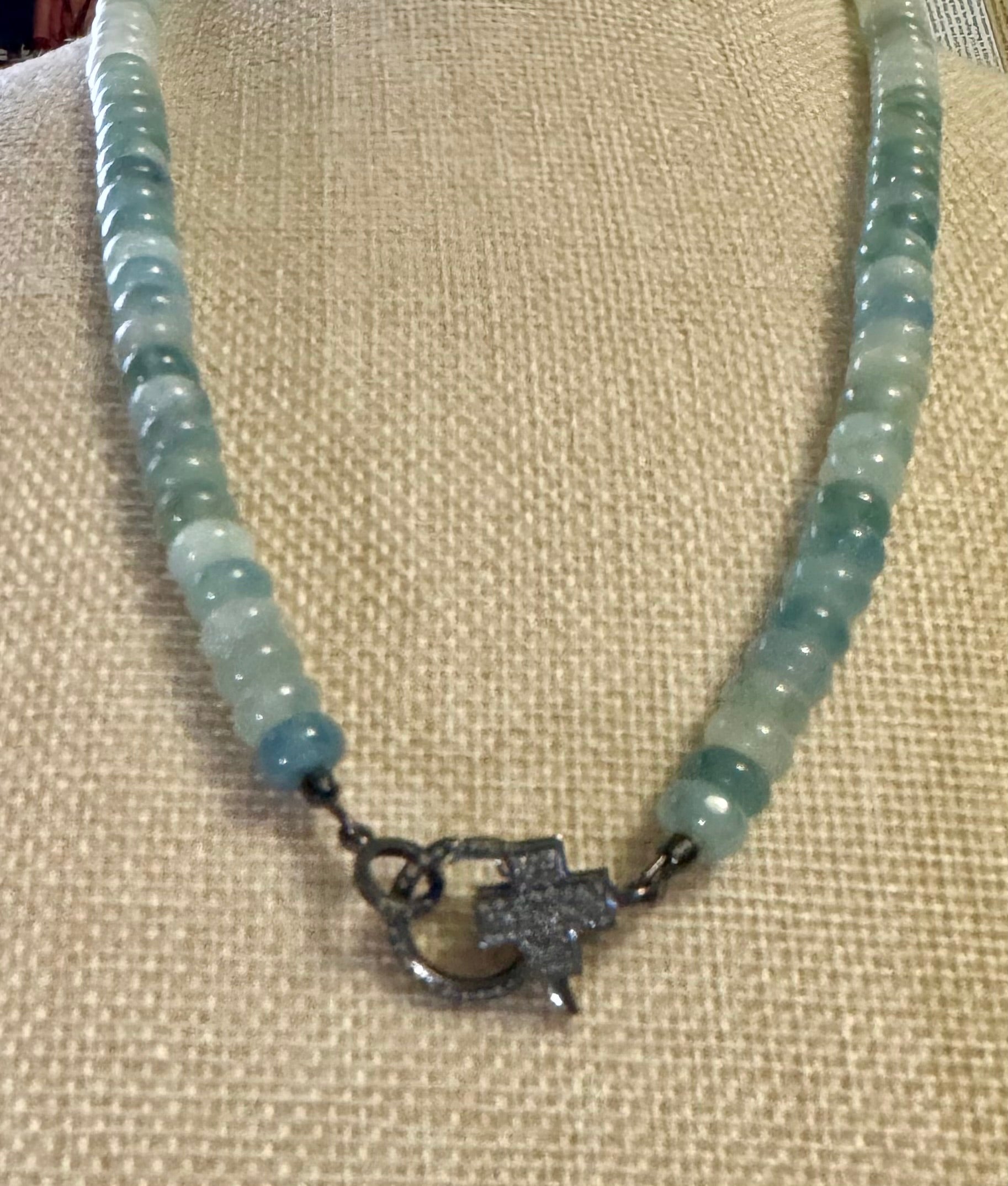 Serene and shaded aquamarine look like Agean Sea water. Beautiful pale blues to greens with so many shades in between. Finished with a sterling silver diamond lobster clasp. Allows for a pendant to be held or to be worn without. 21”L