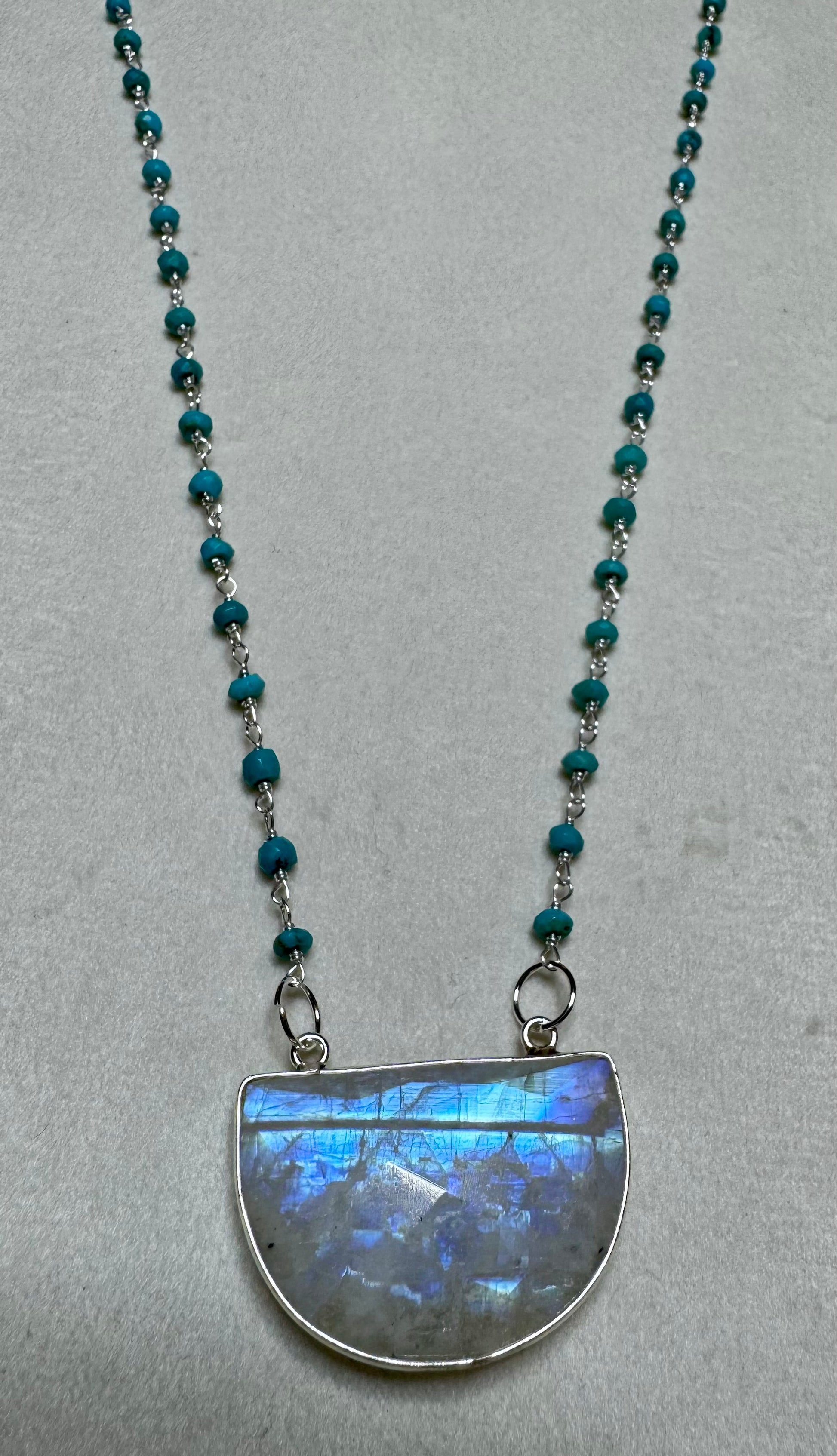 Sleeping beauty turquoise wire wrapped beads and the dancing blue-fire moonstone pendant are radiant together. Delicate, delicious and desirable...you deserve it!