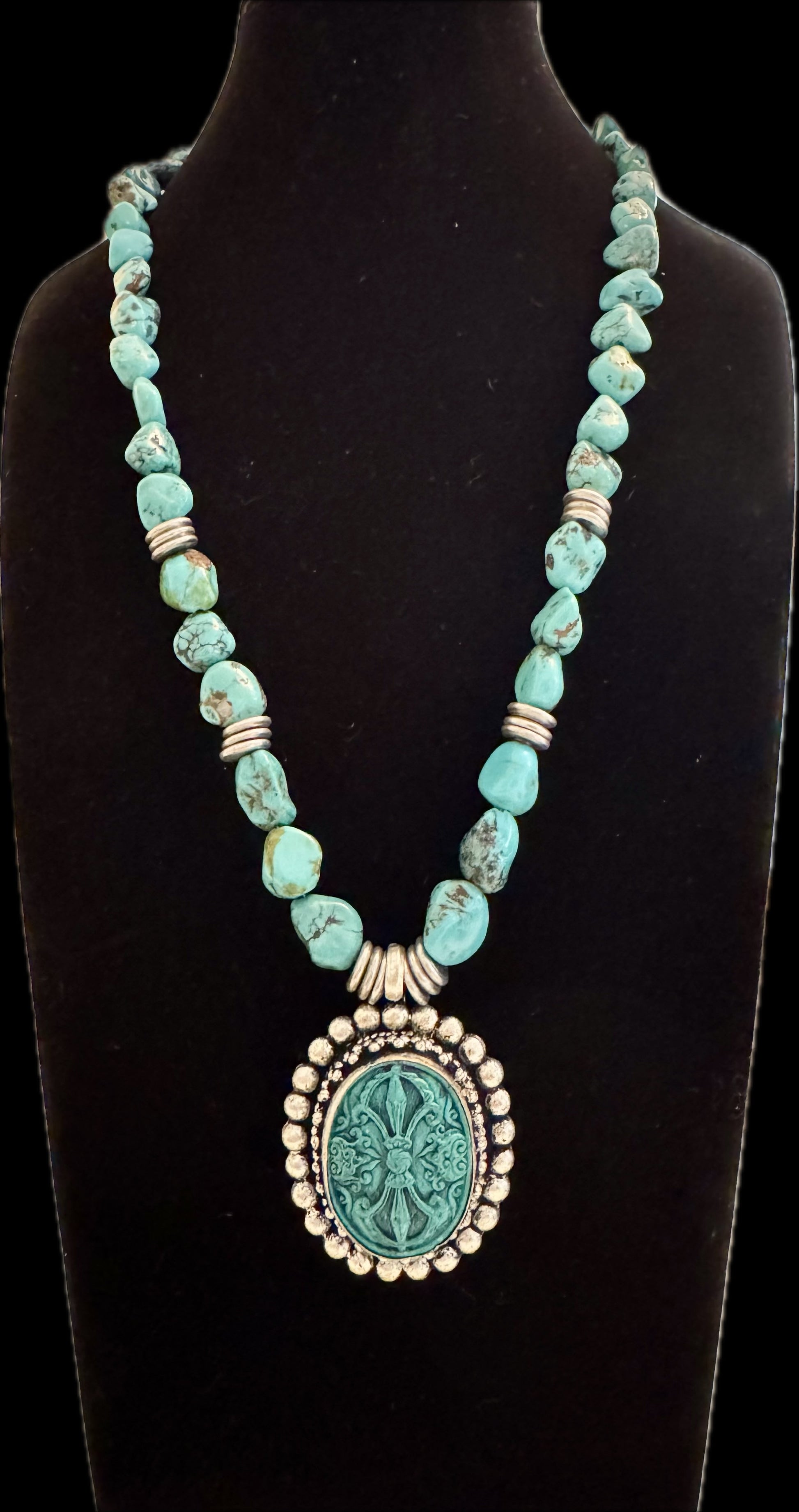 Deeper blue Tibetan turquoise nuggets and a Vajra ( Dorjee) cinnabar /Tibetan silver pendant. White metal accents also adorn this simple beauty. Perfect for summer. 17”L with sterling silver chain extension of 2.75”. Length does not include pendant.